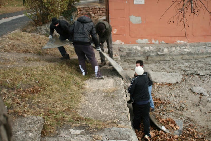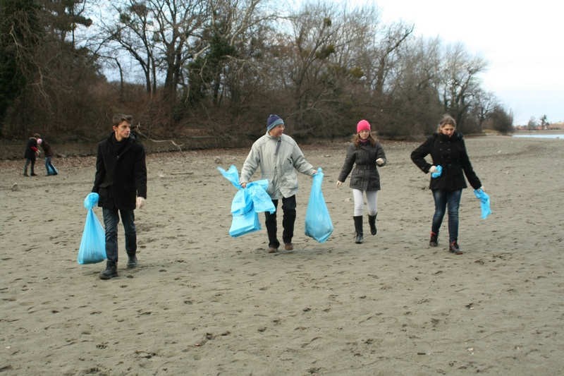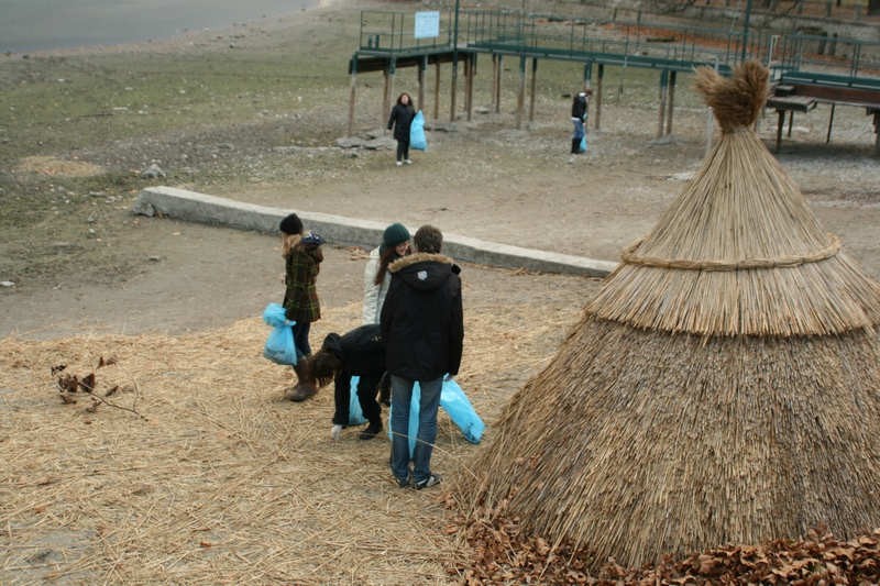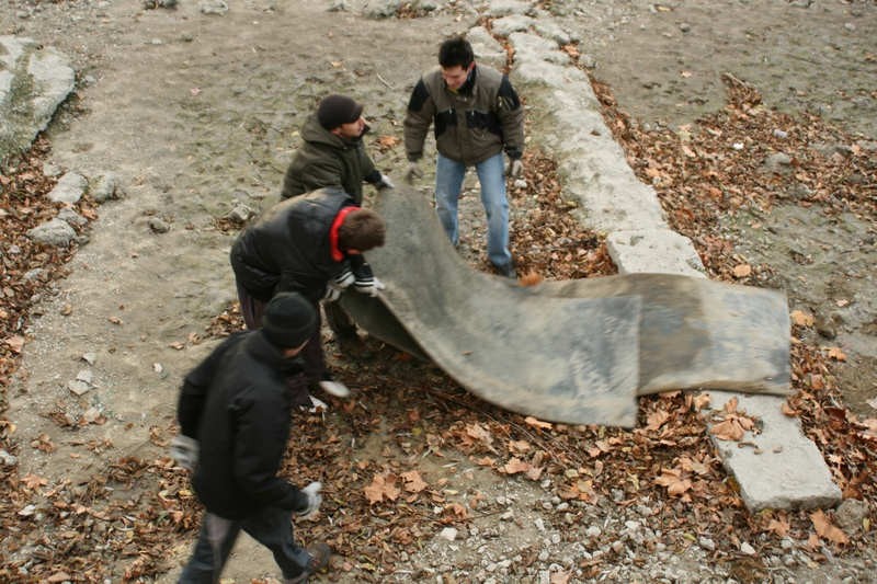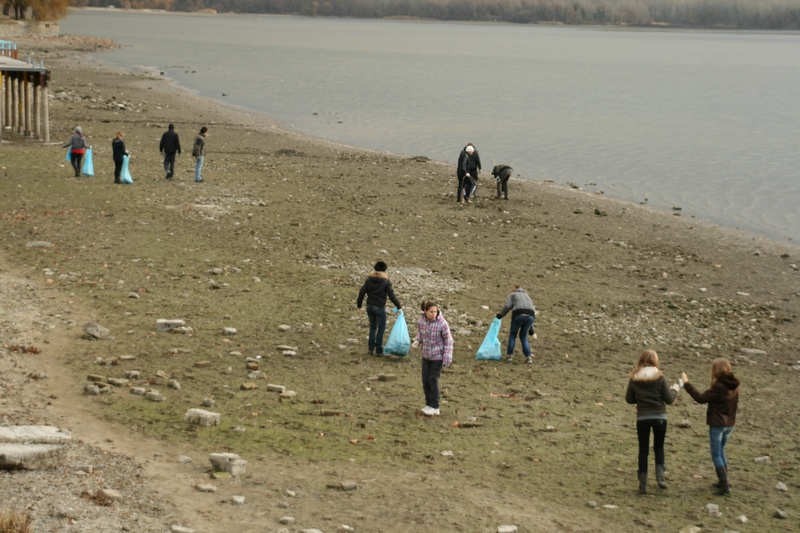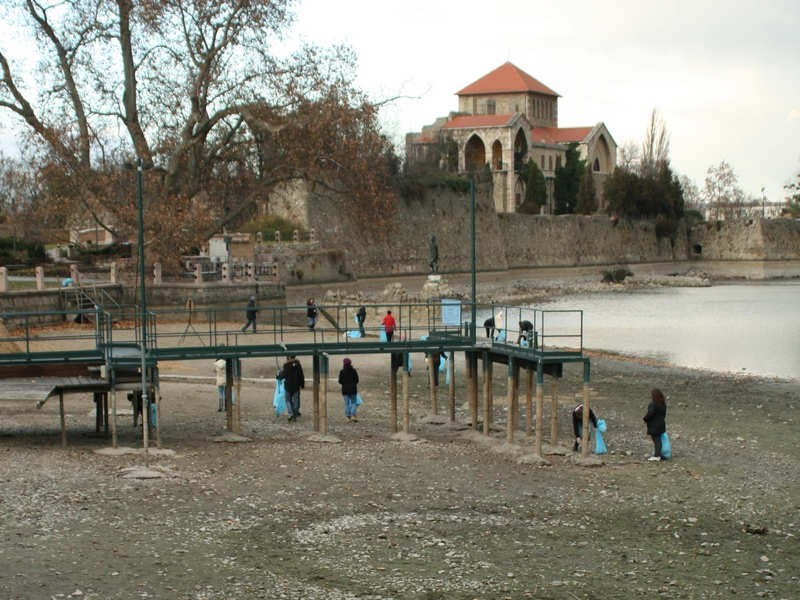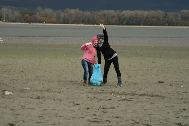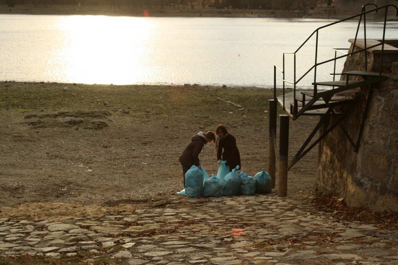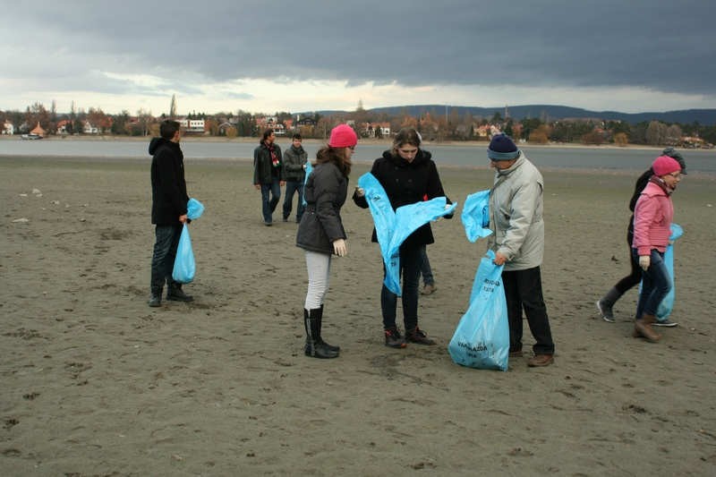 Szemétszedés a leeresztett tatai Öreg-tó medréből.